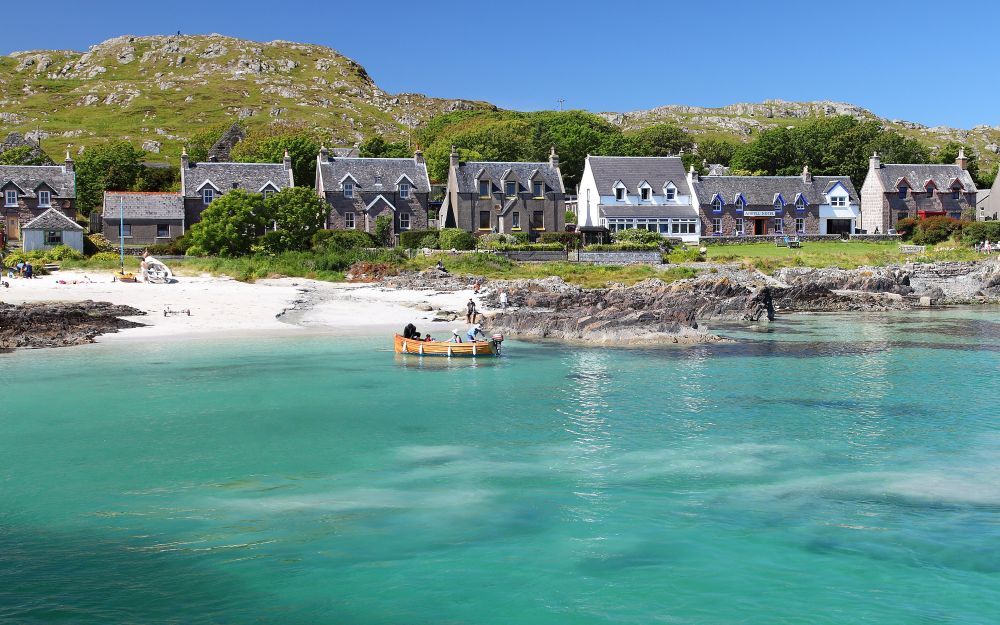 OR stroll along Fidden Beach (back on Mull) – pink granite, white sand, and turquoise water.