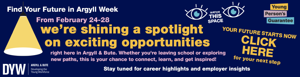 Argyll and Bute is brimming with diverse and rewarding career paths for young people leaving school. From February 24th to 28th, Developing the Young Workforce (DYW) Argyll and Bute is sponsoring ’Find your Future in Argyll Week’, shining a spotlight on the hundreds of career opportunities available right here at home and encouraging young people to explore their potential while contributing to the region’s vibrant future.