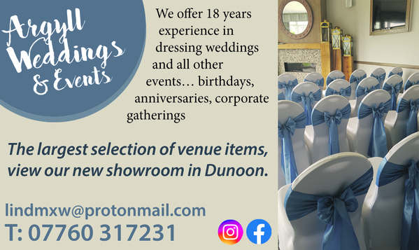 A family-run company, Argyll Weddings and Events, has been styling weddings and events throughout Argyll and Bute for eighteen years. They have dressed many different locations in the region, from Campbeltown to Tiree, including outdoor ceremonies beside the shores of several lochs and beaches, such as Iona, Mull, Islay, and Tiree.