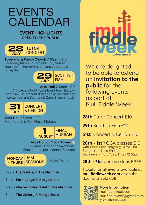 Although lessons are sold out, concert/ceilidh tickets are available on the door of events and in advance at www.mullfiddleweek.com
