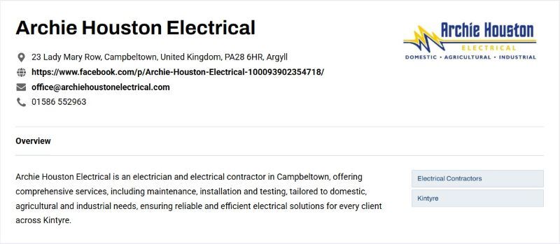 Take Archie Houston Electrical, for example. Based in Campbeltown, they provide everything from electrical installations to maintenance and testing, serving homes, farms, and businesses across Kintyre. Businesses like this keep local communities running smoothly, and the directory makes it easier than ever for people to find trusted services like theirs.