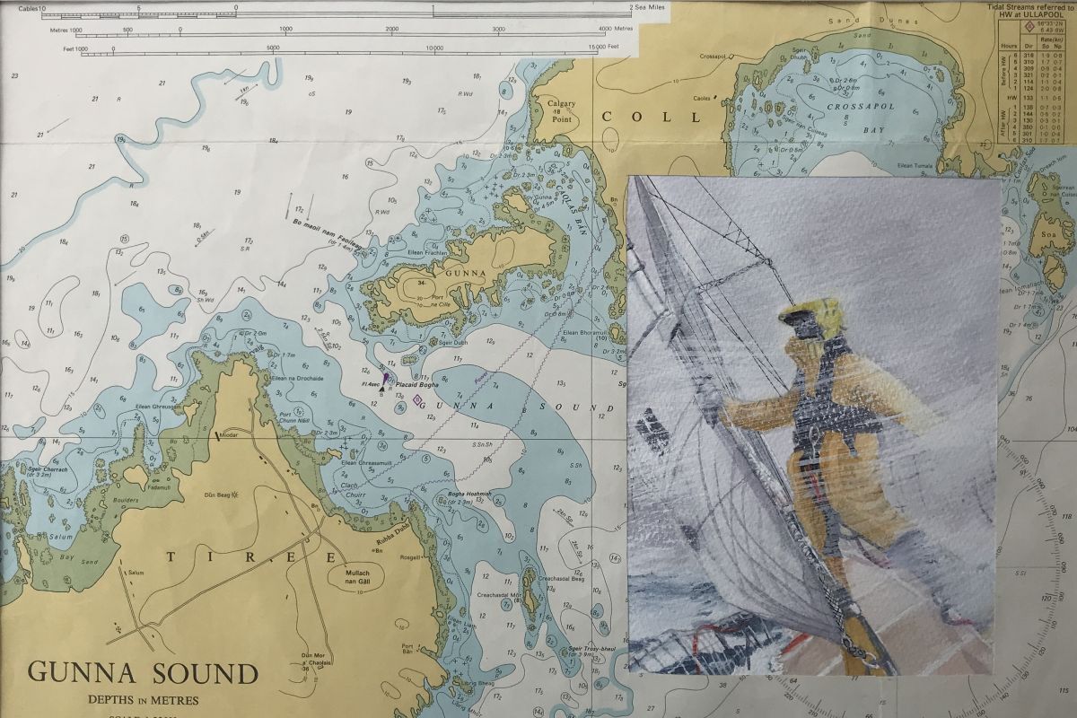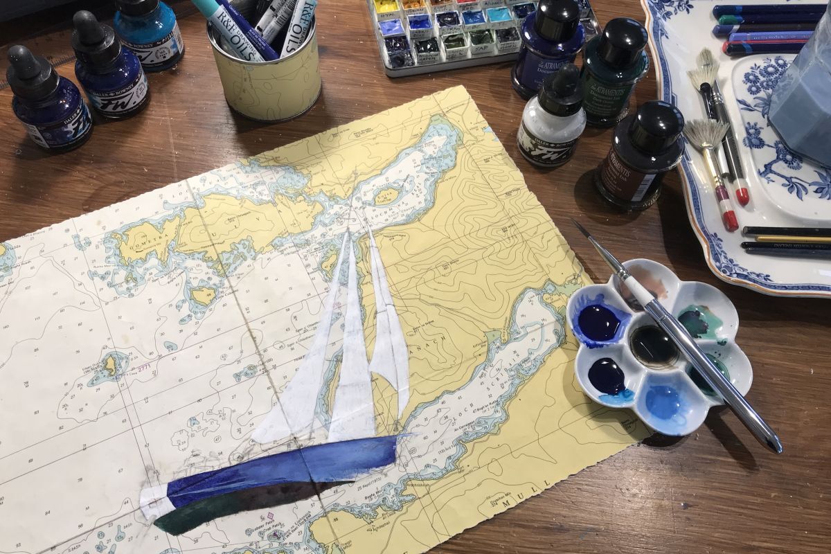 Fiona has already begun creating a series of artworks based on watching live footage from the boats, sea charts of the waters round Oban are her canvas which means she has had to swap her usual watercolours to acrylic inks instead - because ofcourse sea charts are waterproof.