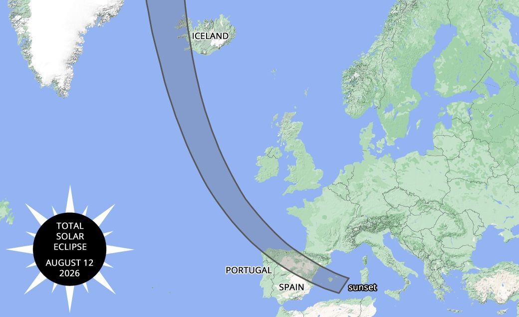 On Wednesday August 12 2026, a total solar eclipse will take place in western Europe. It begins in Greenland, then passes over Iceland and Spain before finishing in the western Mediterranean at the Balearic Islands.