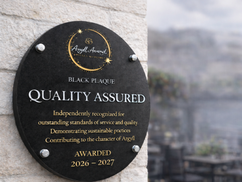 The Argyll Awards Black Plaque recognises businesses that demonstrate exceptional standards of service, presentation, and professionalism within Argyll. It is awarded to establishments that contribute positively to the character and reputation of the region.